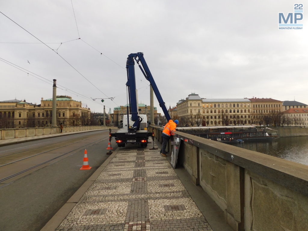 Přikládáme několik fotografií z probíhající akce kontroly mostů v Praze, konkrétně z Mánesova mostu. V Praze probíhají četné kontroly statiky po pádu lávky v Troji.